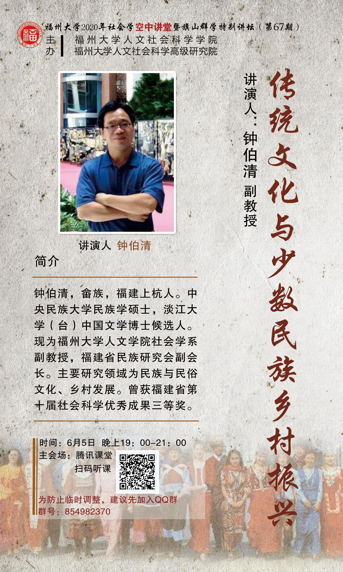 演讲人简介:钟伯清,畲族,福建上杭人。中央民族大学民族学硕士,淡江大学(台)中国文学博士候选人。现为bat365官方官网人文学院社会学系副教授,福建省民族研究会副会长。主要研究领域为民族与民俗文化、乡村发展。曾获福建省第十届社会科学优秀成果三等奖。