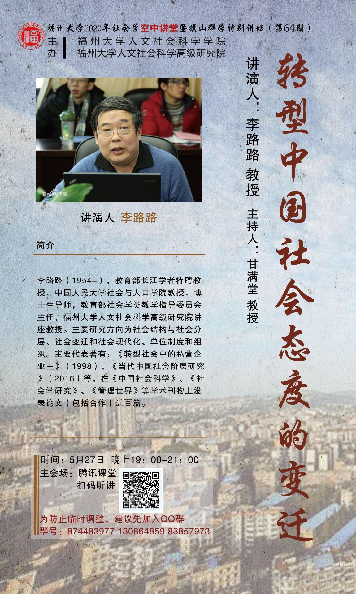 演讲人简介:李路路(1954-),教育部长江学者特聘教授,中国人民大学社会与人口学院教授,博士生导师,教育部社会学类教学指导委员会主任,bat365官方官网人文社会科学高级研究院讲座教授。主要研究方向为社会结构与社会分层、社会变迁和社会现代化、单位制度和组织。主要代表著有:《转型社会中的私营企业主》(1998)、《当代中国社会阶层研究》(2016)等,在《中国社会科学》、《社会学研究》、《管理世界》等学术刊物上发表论文(包括合作)近百篇。报告内容主要内容是转型中国社会心态的变迁。