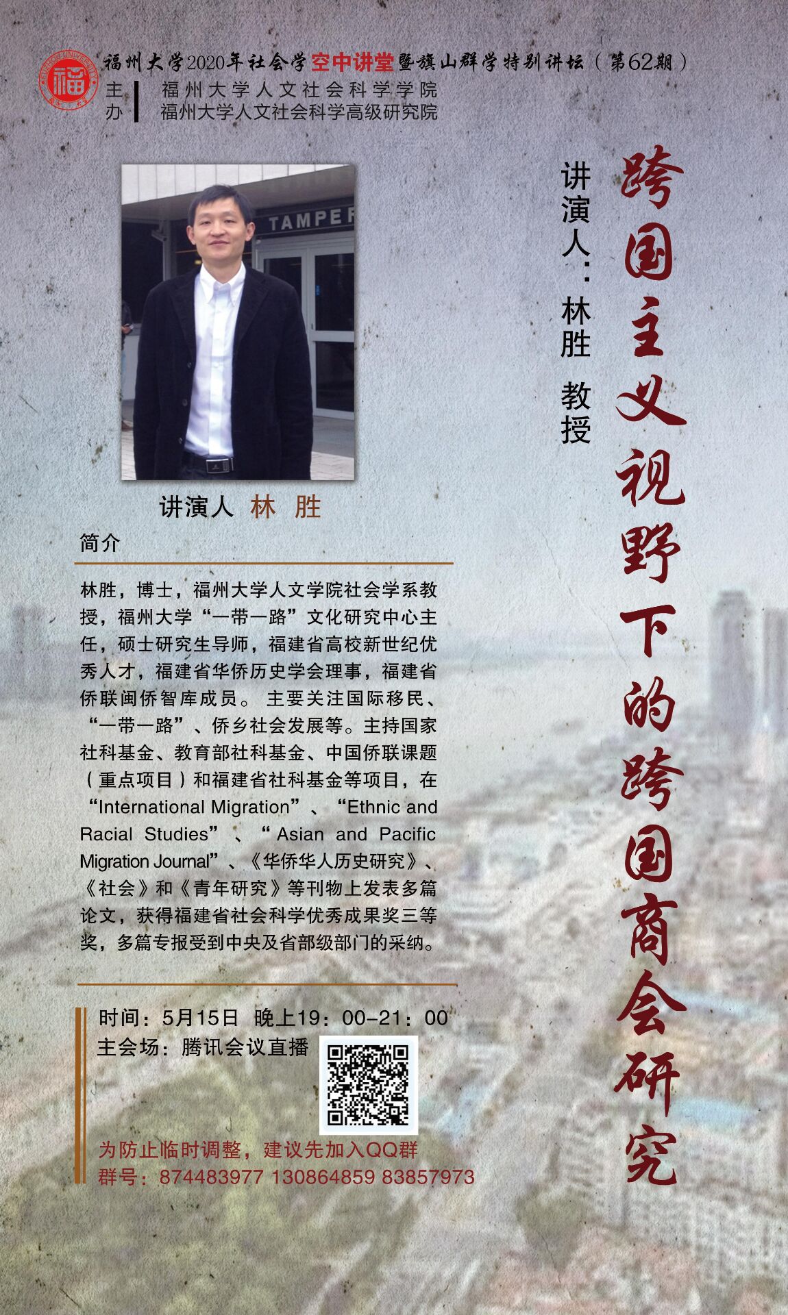 演讲人简介:林胜,博士,bat365官方官网人文学院社会学系教授,bat365官方官网“一带一路”文化研究中心主任,硕士研究生导师,福建省高校新世纪优秀人才,福建省华侨历史学会理事,福建省侨联闽侨智库成员。主要关注国际移民、“一带一路”、侨乡社会发展等。主持国家社科基金、教育部社科基金、中国侨联课题(重点项目)和福建省社科基金等项目,在“International Migration”、“Ethnic and Racial Studies”、“Asian and Pacific Migration Journal”、《华侨华人历史研究》、《青年研究》和《社会》等刊物上发表多篇论文,获得福建省社会科学优秀成果奖三等奖,多篇专报受到中央及省部级部门的采纳。